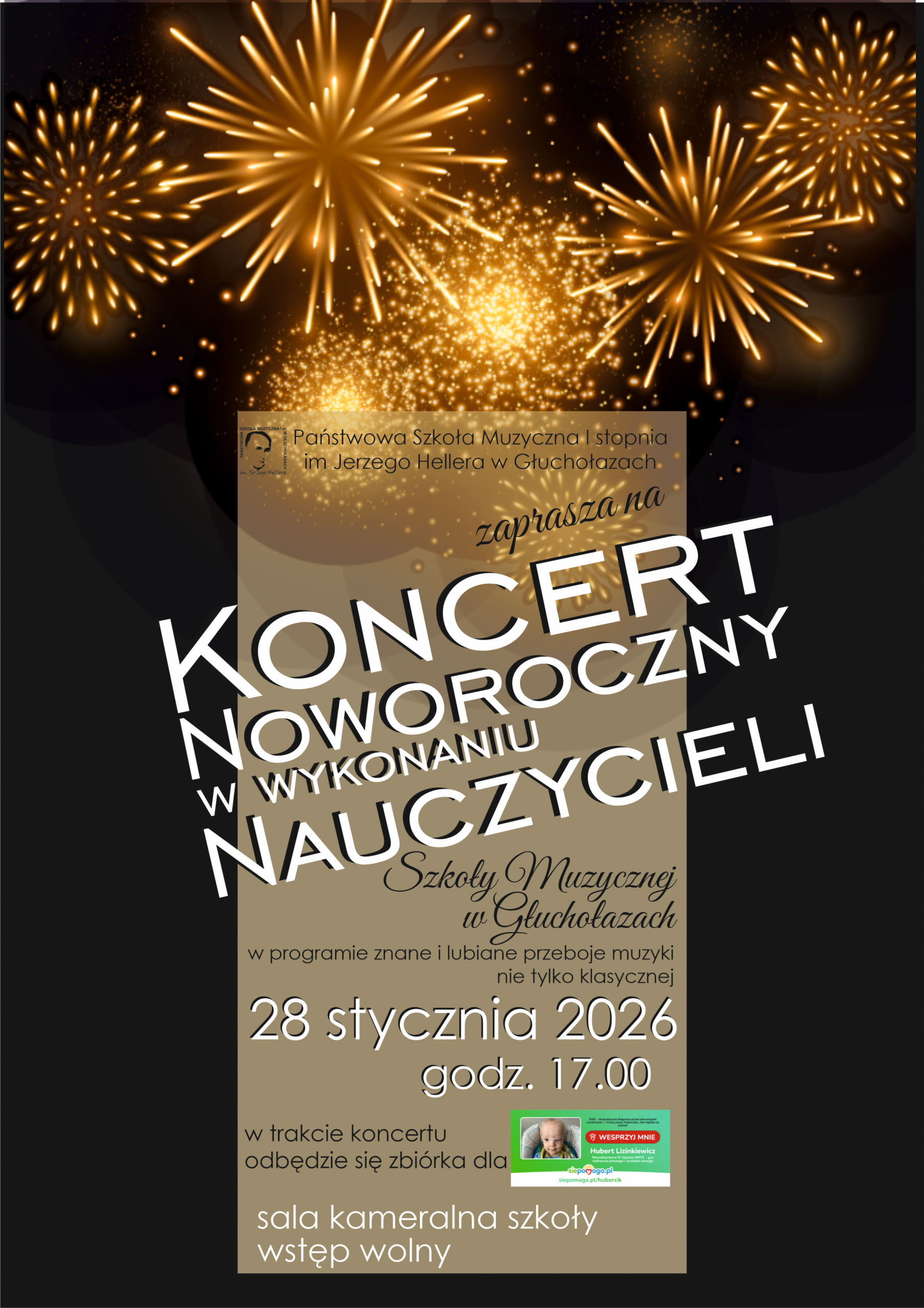 Państwowa Szkoła Muzyczna I stopnia im. Jerzego Hellera w Głuchołazach zaprasza mieszkańców gminy i okolic na wyjątkowy Koncert Noworoczny w wykonaniu nauczycieli Szkoły Muzycznej 🎼. Wydarzenie odbędzie się 28 stycznia 2026 roku (środa) o godzinie 17:00 🕔 w sali kameralnej szkoły. Wstęp wolny 🎟️.