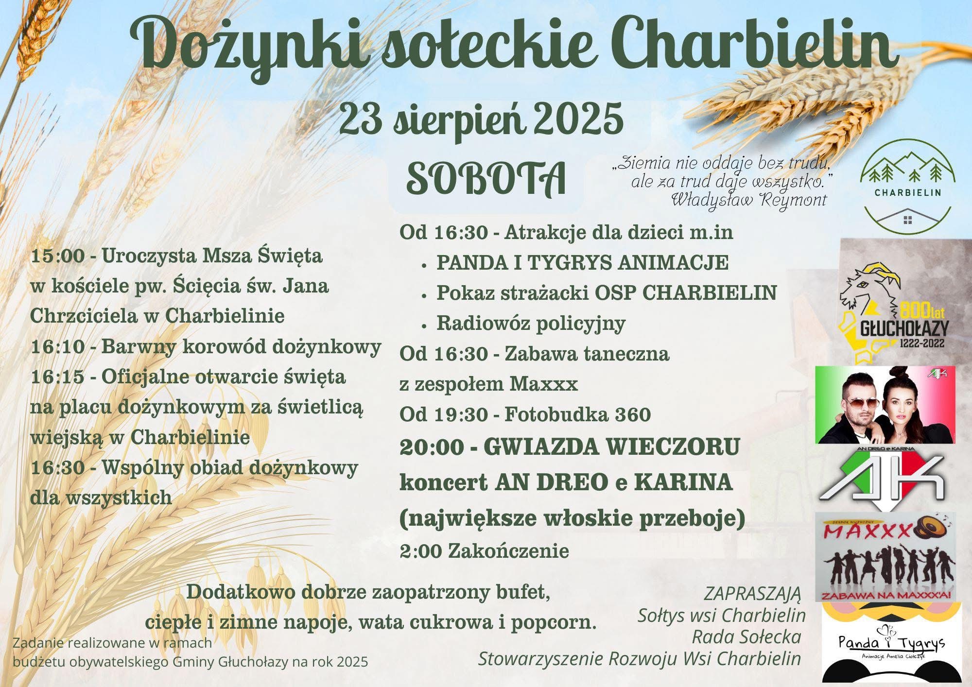 Strona główna / Wydarzenia / Dożynki Sołeckie Charbielin 2025 – Święto Plonów z Bogatym Programem i Gwiazdą Wieczoru